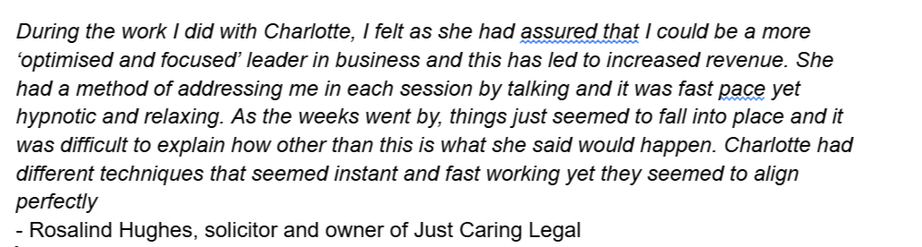 "I recently had the pleasure of working with Charlotte, and the impact was nothing short of incredible. In just one session, I went from grappling with self-doubt and feeling stuck to gaining profound clarity and confidence in my ability to achieve my goals. Charlotte has a remarkable gift for addressing the root causes of self-doubt and guiding you through powerful, actionable strategies. The transformation was immediate and powerful. If you’re struggling with self-doubt and need a breakthrough, I highly recommend Charlotte. Her expertise and compassionate guidance is truly game-changing. Thank you, Charlotte, for helping me unlock my potential and for your invaluable support!"